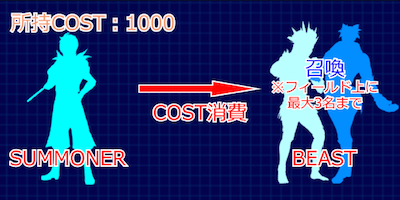 サモナーは『サモンコスト(SC)ゲージ』と呼ばれるゲージを消費し、ビーストを召喚。協力して戦います。
